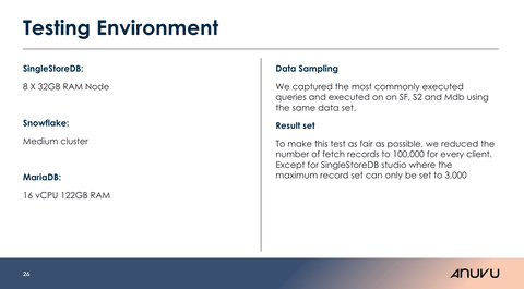 Using an existing client's query needs, Anuvu set up the testing environment for SingleStoreDB, Snowflake and MariaDB.